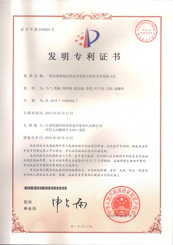 發(fā)明專利(一種高效吸濕活性炭纖維復合材料及其制備方法)